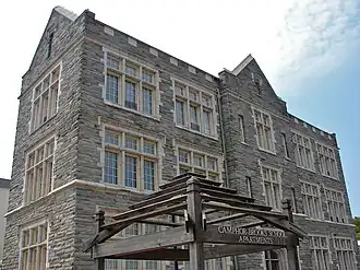 Designed by Henry deCourcy Richards and built in 1919, the George L. Brooks School encompasses part of the original walls of the school's 1902 edifice that had been destroyed by fire. It is a three-story, five-bay, stone and brick building situated on a raised basement, and was designed in the Late Gothic Revival-style. It features a slightly projecting entrance bay with Gothic arched entryway and a crenellated parapet.[2]