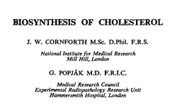 In this way and through enzymological methods he was able to elucidate the individual reaction steps in the formation of cholesterol together with Konrad Bloch, Feodor Lynen and especially with John W. Cornforth, with whom he worked extensively from 1948 to 1968. In addition, Popják demonstrated that fatty acid synthesis does not take place in the mitochondria as a reversal of β-oxidation, but is based on an independent enzyme system in the cytosol. After moving to UCLA he focused primarily on the regulation of cholesterol biosynthesis.[1]