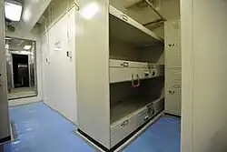 Systems that reduce crew workload have allowed the ship's company on Gerald R. Ford-class carriers to total only 2,600 sailors, about 700 fewer than a Nimitz-class carrier. The massive, 180-man berthing areas on the Nimitz class are replaced by 40-rack berthing areas on Gerald R. Ford-class carriers. The smaller berthings are quieter and the layout requires less foot traffic through other spaces.[56] Typically the racks are stacked three high, with locker space per person. The berthings do not feature modern "sit-up" racks with more headroom; bottom and middle racks only accommodate a sailor lying down. Each berthing has an associated head, including showers, vacuum-powered septic-system toilets (no urinals since the berthings are built gender-neutral)[57] and sinks to reduce travel and traffic to access those facilities. WiFi-enabled lounges are located across the passageway in separate spaces from the berthing's racks.[56]