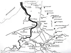 At the fortified city of Antwerp, German troops besieged a garrison of Belgian fortress troops, the Belgian field army and the British Royal Naval Division. The city was ringed by forts, known as the National Redoubt and was invested to the south and east by German forces, which began a bombardment of the Belgian fortifications with heavy and super-heavy artillery on 28 September. The Belgian garrison had no hope of victory without relief and despite the arrival of the Royal Naval Division beginning on 3 October the Germans penetrated the outer ring of forts. The German advance began to compress a corridor from the west of the city along the Dutch border to the coast. The Belgians at Antwerp had used the strip to maintain contact with the rest of unoccupied Belgium and the Belgian field army commenced a withdrawal westwards towards the coast.[23]