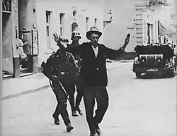On September 9, the first public execution took place in the Old Market Square in Bydgoszcz, where 20 people were killed.[23][25] The Poles gathered in the square before the execution were beaten with rifle butts, forced to fall and rise, and stand for hours with their hands raised.[26][27] When a German soldier was shot on the night of September 9 to 10, Braemer ordered that the next day, another 20 hostages be shot in the Bydgoszcz market square. On September 10, five other civilians were shot in the square – allegedly while attempting to escape.[23] It was not uncommon for local Volksdeutsche to pass among the rows of detained Poles and Jews, pointing out supposed participants of the Bydgoszcz "Bloody Sunday" to the escort. These people were then separated from the rest of the prisoners, marked with a cross sign using white paint, and shot.[28][29] In this way, among others, 20 Poles detained on Saperów Street perished.[30]