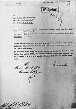 On September 11, the German Supreme Command of the Army (Oberkommando des Heeres) informed the 4th Army that Hitler, due to the rebellious Polish population in Bydgoszcz, ordered the Reichsführer-SS to take 500 hostages and undertake the most severe measures (summary executions) until the city is pacified. The army is to be ordered not to interfere with the Reichsführer-SS authorities.[20] The extermination action in Bydgoszcz then took a new course. Poles accused of participating in the "Bloody Sunday" and intelligentsia were now being liquidated. The main role in the repressive actions was played by Selbstschutz, its formations, and Ordnungspolizei.[33] On September 18, Einsatzgruppe IV officers directed the first transport consisting of 62 people from Bydgoszcz to the Dachau concentration camp.[34] At the same time, a secret order was issued to the Dachau commander to shoot all prisoners upon the arrival of the transport – except for Canon Józef Schulz.[f][35] Large roundups continued in various districts. On the night of October 1 to 2, 2,000 Poles were temporarily arrested. On October 6, on the orders of the mayor Kampe, a large roundup was organized, during which anyone who did not have a certificate of employment issued by the Employment Office was detained.[36]