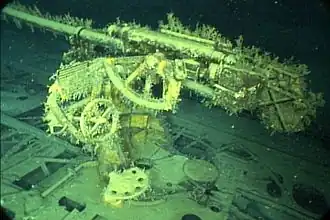 Oceanographer and National Geographic Explorer-in-Residence Robert Ballard explored and mapped the wreck in the summer of 2014 with remotely operated vehicles, where they noticed that the submarine's bow had been blown off and was found resting on the seafloor 100 feet away from the main hull. They determined that the bow of the submarine was destroyed, apparently by a depth charge that landed on the forward deck, exploded, and caused an internal detonation of the submarine's own torpedoes, which broke off the bow. If so, this would be one of the few successful submarine kills caused by direct contact from a depth charge, as typical attacks relied upon depth charges exploding a short distance away to inflict repeated hydraulic shocks that would eventually crack a submarine's pressure hull.[15][16]