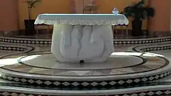 It is made up of the Presbytery, located in the apse, with a step higher than the hall, the Ambon and the sacramental area, with a wooden dome (in glued laminated timber) above it; the floor here is realized with polychrome marbles and so believers can differentiate the meaning of the different liturgical functions;[2] a central nave, corresponding with the hall, and with about 600 seats, and two aisles for the coming in and out of people, and for the processional route during the functions; the parvis which permits the outdoor celebrations with great participation of believers, thanks to its position on the top of the staircases.[2]