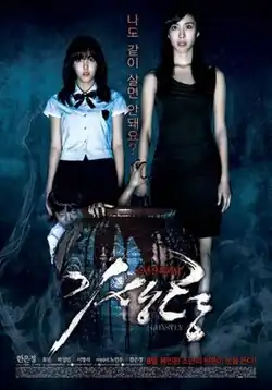 Ghastly (Korean고死: 기생령) is a 2011 Korean horror movie starring Han Eun-jung, Park Hyo-min and Lee Hyung-suk. The film tells the story of Seo-Ni (Han Eun-jung) who raises her orphan nephew Bin (Lee Hyung-suk).[1] Seo-Ni then becomes involved in a horrifying mystery and discovers a shocking secret about her family.[2] This is singer Hyomin's big screen debut and Ko Seok-jin's directorial debut.[3][4] The movie featured cameos from singers T-ara, Hahm Eun-jung, and No Min-woo.[5][6] The movie hit the theatres on August 4, 2011. The film became Asia's first horror/thriller movie released in 3D with 3D specialist company KDC Information & Communication.[7]