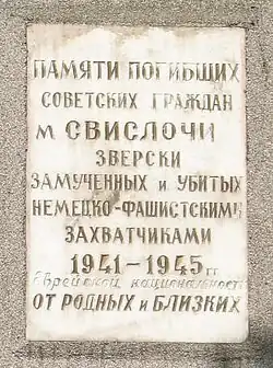 After the war, at the site of the mass execution, the Jews of Svislach, who returned from the evacuation by the Red Army, erected a small obelisk with a metal fence. Subsequently, the monument was removed, and the ashes of those killed were reburied at the Jewish cemetery in Bobruisk.[11] As of 2021, the place of execution in Svislach is not indicated. In 1949, in Bobruisk, an obelisk was erected at the place of reburial with the word "In memory of the dead Soviet citizens of Svislach, brutally tortured and killed by Nazi Invaders in 1941-1945; From relatives and friends" In 2003, at the initiative of the Jewish community of Bobruisk, the monument was reconstructed and the words "of Jewish nationality" were added to the slab.[1][2][4]