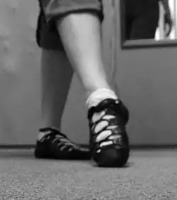 Like ballet shoes, ghillies are generally made from leather, and have similar soles. Many dancers who start in Highland or Irish dancing will first use ballet shoes, as the cost is considerably lower. The most easily recognizable difference between ballet shoes and ghillies is that ghillies use laces to fasten them to the foot, whereas ballet shoes generally use an elastic across the ankle. Also the laces are very long, and are wrapped around the ankle and foot before tied. Other differences are that ghillies do not have a string/elastic around the edge of the shoe to tighten them, and the soles of ghillies are not usually stitched on, but glued on.