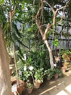 Today the garden contains about 300 species of useful tropical plants, primarily from Africa and the Americas. Plants are grouped according to use, with most in greenhouses but several dozen species growing outdoors. The collection includes sources of food (banana, cocoa, coconut, date, mango, papaya, pineapple, vanilla, and others), wood (mahogany, etc.), textiles (such as cotton), and dyes and perfumes.