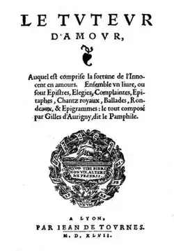 - Le Tuteur d'amour, auquel est comprise la fortune de l'Innocent en amour, composé par Gilles d'Aurigny dict le Pamphille. Ensemble un livre où sont epistres, elegies, complainctes, epitaphes, chants royaulx, ballades ou rondeaulx (1546), reprinted in Lyon 1547 [1], Paris 1553.