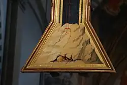 At the bottom, on the trapezoidal base, the arid rocks in perspective form a naturalistic base, alluding to Mount Golgotha, on which the cross is sunk. According to medieval tradition, the tomb of Adam, the first man, was placed on Mount Golgotha. Christ's blood trickles down from the cross into the rocks, then reaches the cavity containing Adam's bones, as a symbol of man's redemption from sin through Christ's sacrifice.