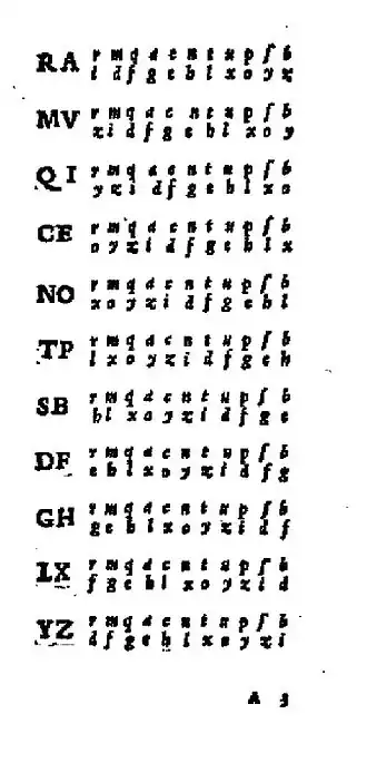 Bellaso's second booklet appeared in 1555 as a continuation of the first. The lower halves of the alphabets are now shifted regularly, but the alphabets and the index letters are mixed by means of a mnemonic key phrase, which can be different with each correspondent.
