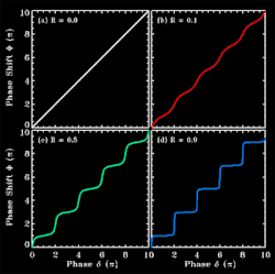 For R = 0, no reflection from the first surface and the resultant nonlinear phase shift is equal to the round-trip phase change () – linear response. However, as can be seen, when R is increased, the nonlinear phase shift gives the nonlinear response to and shows step-like behavior. Gires–Tournois etalon has applications for laser pulse compression and nonlinear Michelson interferometer.