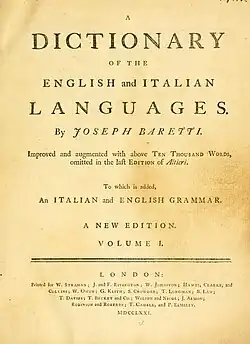 - ^ a b Baretti, Joseph (1795). "A Dictionary of the Italian and English Languages". Printed by Joseph Orlandelli for the late Francis Pezzana. Venice.