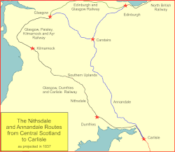 It was not only the GPK&AR who considered making a trunk line southwards: a strong body of opinion considered that a route directly over the hills of the Southern Uplands was superior, with a shorter mileage. This became known as the proposed Annandale route to Carlisle, but Kilmarnock was not an ideal starting point to go that way. The GPK&AR's supporters intended a line from Kilmarnock via Dumfries, and this was the proposed Nithsdale route. Although longer, this had much easier gradients—at the time engine power was considered to be inadequate for a hillier route—and would go through more populous districts, bringing in more intermediate business; in addition it would be cheaper to build. Meanwhile, many people supported an east coast route that would reach England from Edinburgh by way of Dunbar and Berwick.[3][5]