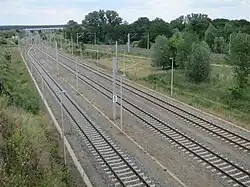 ![]() Route west of Selchow. On the left is the long-distance line from Glasower Damm and on the right is the S-Bahn line from Schönefeld. | ||||||||||||||||||||||||||||||||||||||||||||||||||||||||||||||||||||||||||||||||||||||||||||||||||||||||||||||||||||||||||||||||||||||||||||||||||