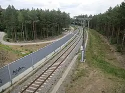 The planning approval process for the eastern connection to the Görlitz Railway was delayed due to changes to the plan. Originally an upgrade of the existing line was planned,[8] which could not be built because of the tight curve radii and the noise pollution for the residents, among other things. The planning approval process only started in 2007. Among several options tested, one involved building a line through the forest, running about 250 metres south of the old line. There were a number of protests by local residents and conservationists against its construction, partly because 14 hectares of forest had to be cleared. Due to the delays, there were fears that the eastern connection would not be completed by the planned opening of the airport in 2011,[10] so alternative connection concepts were considered.
