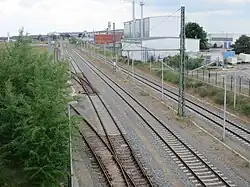 The southern part of the airport was transferred for civilian use to Deutsche Lufthansa of East Germany (later Interflug) on 27 April 1955. Initially, the former Henschel Railway continued to be used for the supply of materials and fuels.[4] This line proved not to have sufficient capacity with the growth of the airport and it was also severely hampered the increasing road traffic. As a result a new siding was built in 1959 from the Grünbergallee station on the Berlin Outer Freight Ring (Güteraußenring, GAR) and the old line was closed.[5] By the beginning of the 1960s, it became apparent that this line could no longer be used in the longer term. On the one hand, the line crossed the freeway that was under construction to the airport, on the other hand, the route of the GAR was needed for the future S-Bahn to Schönefeld. First, a track was laid parallel to the GAR, but due to the A 113 autobahn, which was under construction there, it could not be used in the longer-term.[5]