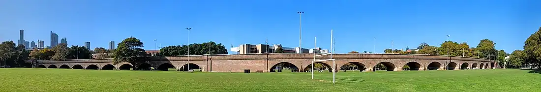 Jubilee Park viaduct is a 28-span brick arch viaduct built on a curve extending from the east of Jubilee Park at Victoria Road to The Crescent, Annandale. The viaduct contains more than two million bricks from the former State Brickworks at Homebush Bay. The bricks are laid in English bond pattern with soldier courses defining the archways. The arches are evenly spaced, being 28 x 10.06-metre (33.0 ft) clear spans. The viaduct stretches approximately 446.5 metres (1,465 ft), making it the largest brick viaduct in the NSW rail system.[1]
