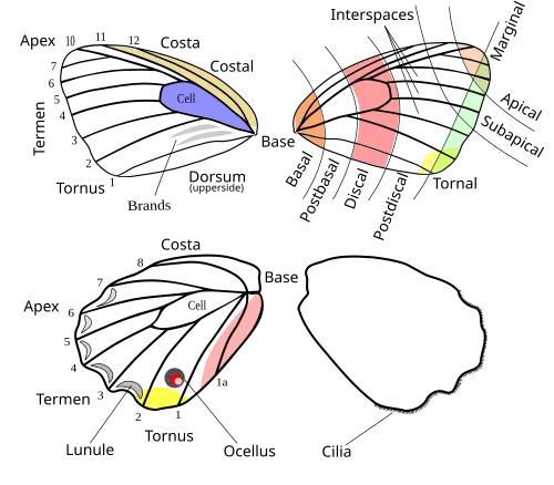 Prominent cells on the forewings of some moths. Their size, shape and colour can be useful in identifying some species. Also the prominent cell, usually opaque and coloured, near the tip of each wing of the Odonata, on the anterior margin; also called pterostigma.