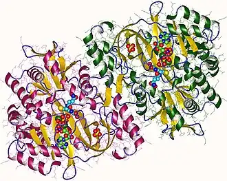 - ^ Hara T, Kato H, Katsube Y, Oda J (Sep 1996). "A pseudo-michaelis quaternary complex in the reverse reaction of a ligase: structure of Escherichia coli B glutathione synthetase complexed with ADP, glutathione, and sulfate at 2.0 A resolution". Biochemistry. 35 (37): 11967–74. doi:10.1021/bi9605245. PMID 8810901.