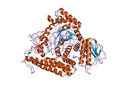 Members of this family consist of three structural domains. Deletion mutants of alpha-glucuronidase from Bacillus stearothermophilus have indicated that the central region is responsible for the catalytic activity. Within this central domain, the invariant Glu and Asp (residues 391 and 364 respectively from Bacillus stearothermophilus) are thought to form the catalytic centre.[8] The C-terminal region of alpha-glucuronidase is mainly alpha-helical. It wraps around the catalytic domain, making additional interactions both with the N-terminal domain of its parent monomer and also forming the majority of the dimer-surface with the equivalent C-terminal domain of the other monomer of the dimer.[9]