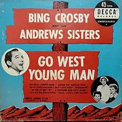 Go West Young Man is a compilation album of songs on one 10" vinyl record by Bing Crosby and The Andrews Sisters released in 1950 featuring songs that were sung by Crosby and the Sisters with a Western-type genre. This album is one of the first by Crosby to not be released on 78 rpm records before going straight to an LP or set of 45s. The album includes several songs which had already enjoyed Billboard chart success. “Along the Navajo Trail” reached the No. 2 position in 1945 and "One Hundred and Sixty Acres", "Have I Told You Lately That I Love You?" and "Quicksilver" also charted.[1]
