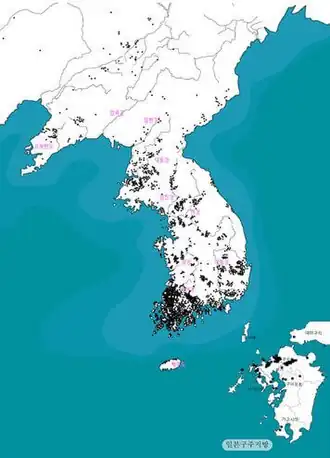 Dolmens in South Korea are mostly concentrated in South Jeolla Province. By region, there are 338 in Gangwon Province, 502 in Gyeonggi Province, 189 in North Chungcheong Province, 1597 in North Jeolla Province, 10,068 in South Jeolla Province, 2,800 in North Gyeongsang Province, and 140 in Jeju Province.[25]