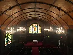 The building was designed by J. Phillip Rinn, who also designed the Barnum Museum of Natural History and part of Metcalf Hall at Tufts. The edifice was designed in the Lombardic Romanesque Style, with the chapel's hundred-foot bell tower and its cloister, a porch on the east side of the building. The blue-gray slate was quarried locally from Somerville. Originally, Rinn planned the chapel to be covered with ivy to soften the austerity of the stonework. The interior design also follows Romanesque motifs with the incorporation of the ribbed ceilings, arched woodwork, and stained glass. The pews, pulpit, and ceiling ribs are made of cherry. The floors are made of oak while the paneling is made of spruce. Today virtually all of the original woodwork is intact. In 2002, the chapel underwent a major restoration. The project returned the chapel ceiling which was painted blue to its native wood.[1] The organ, located on the left side of the chancel, was modernized by removing cherry stained wood decorations and panels in front of case pipes. The Andover Organ Company was contracted to rebuild the organ and restore the front of the chapel.[2]