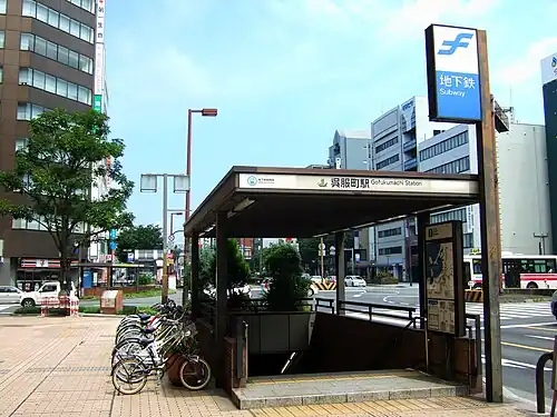 Gofukumachi Station (呉服町駅, Gofukumachi-eki) is a Fukuoka City Subway station located in Hakata-ku, Fukuoka in Japan. Its station symbol is a green trading ship from the Heian period.