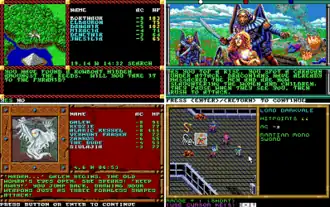 Clockwise from upper left: overland map exploration; plot cut scene; overall combat interface; dungeon exploration view/battle encounter approach