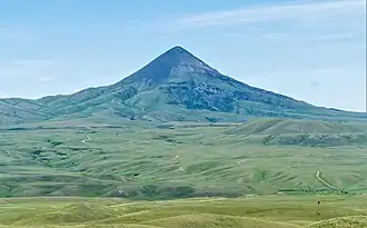 The Sweet Grass Hills are sacred to the Blackfoot and other tribes.[6] Mountain Chief, Calf Tail, and Bull Lodge experienced their respective vision quests on Gold Butte.[5] The ghost town of "Gold Butte" was a gold-mining camp located on the mountain's northwest slope after gold was discovered here in 1884.[7][8] The landform's toponym has been officially adopted by the United States Board on Geographic Names.[3]