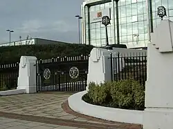 Central gates, gate piers and railngs to the former Firestone Factory. 1928 by Wallis, Gilbert and Partners.