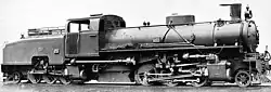A single rigid frame ran the length of the locomotive and carried the boiler, fuel and water.[1] The front engine unit swivelled under the boiler and smokestack, in a similar manner to a Meyer and looking somewhat like a Mallet; in contrast a Garratt had its front bogie in front of the boiler. The rear engine unit was placed underneath the tender, in a manner similar to a Garratt; however, while a Garratt carried both coal and water directly on the rear bogie, the Golwé had its fuel bunker mounted on the central frame. The water tank was mounted directly on the rear steam bogie and embraced the fuel bunker and rear end of the main frame.[2] The rear bogie cylinders were placed under the cab, at the front of the rear unit. A float-controlled automatic device increased the cut-off of the rear cylinders to prevent slipping when the water tank was running low. The firebox hung low between the two engine units and so could be of generous size.[1]