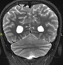 Aside from the physical characteristics of the eyes there is also less sensation in the eyes when stimulated.[4] The eyes also show low motor control (ataxia).[4] Along with ataxia comes a lack of coordination or ability to judge the distance of objects (dysmetria).[6] MRIs show a constant feature of rhombencephalosynapsis–a condition marked by the absence or partial absence of the cerebellar vermis and varying degrees of fusion in the cerebellum in every case of Gómez–López-Hernández syndrome.[4][7][8] Also absent are the trigeminal nerve of the trigeminal cave and the foramen rotundum, causing abnormal sensations on the forehead and the corneas.[6][8] One Gómez–López-Hernández syndrome case in Japan also presents fever-induced seizures.[9] Others may or may not present with non-fever-induced seizures.[4] Malformations of motor centers in the brain cause reduced muscle strength (hypotonia).[8] Eleven of fifteen people in one study showed moderate-to-severe intellectual disability.[6] In cases where it has been noted, head nodding is present.[6] Hydrocephalus and enlargement of the ventricular system is consistently present.[6] A reduced corpus callosum is present in some cases (agenesis of the corpus callosum).[6]