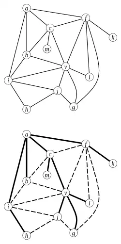 A plane graph (top), a good spanning tree of (down) solid edges are part of good spanning tree and dotted edges are non-tree edges in with respect to .