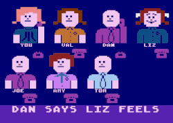 The majority of the screen is taken up with eight characters: You, Val, Joe, Liz, Amy, Dan, Sue and Tom. The player uses a joystick cursor to select a character to telephone. That person’s phone rings with a jiggling animation and ringing sound effect. He or she picks up the phone and says, “Air-oh?” The player selects a person to gossip about, and then one of five expressive animations (strong positive, slight positive, neutral, slight negative, strong negative). The listener responds with his or her own opinion of the person.