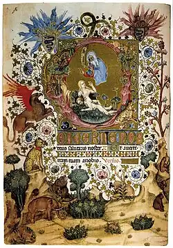 The other strand alongside Michelino’s gentle style was the grotesque, taken from the works of Franco and Filippolo de Veris in the fresco of the Giudizio universale in the Church of Santa Maria dei Ghirli in Campione d'Italia (1400), or from the expressive miniatures of Belbello da Pavia. For example, in the Bibbia di Niccolò d'Este, illuminated by Belbello between 1431–1434, fluid and distorting lines, physically imposing figures, exaggerated gestures, and bright, shifting colors are used. He remained faithful to this vocabulary throughout his long career, until around 1470.[9]: 2:9 Another famous manuscript that saw collaboration between Belbello and the so-called Maestro delle Vitae Imperatorum (an unnamed figure already the author of the copy of Suetonius’s Vitae Imperatorum held at the National Library of France) is the Semideus by Cato Sacco, now preserved in the Russian National Library.[2]: 190