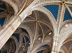 Upon Gian Galeazzo’s death in 1402, the church’s construction slowed significantly: work resumed noticeably with the rise of the Sforza, who restarted the project in a style blending late Gothic and Renaissance, seeing it concluded with the creation of the facade, a masterpiece of the Lombard Renaissance. Of the original late Gothic layout, already deeply modified and remodeled in the Renaissance period, the three naves separated by sturdy bundled pillars with Gothic ribbed vaulting remain clearly visible, inspired by the hall of the Milan Cathedral.[3]