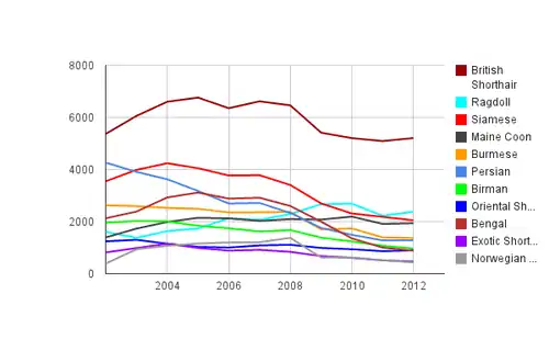 The top three most popular cat breeds registered in the GCCF are the British Shorthair, the Ragdoll and the Maine Coon.[6] The GCCF registers around 20,000 pedigree cats each year, and currently recognises the following breeds: