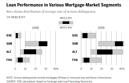 The Commission found GSE loans had a delinquency rate of 6.2% in 2008 versus 28.3% for non-GSE or private label loans.[40] Taking the roughly 25 million mortgages outstanding at the end of each year from 2006 through 2009 and subdividing them into 500+ subgroups according to characteristics like credit scores, down payment and mortgage size, mortgage purchaser/guaranteer, etc., the Commission found the average rate of serious delinquencies much lower among loans purchased or guaranteed by government sponsored organizations such as the FHA, Fannie Mae and Freddie Mac, than among non-prime loans sold into "private label" securitization.[41] (see "Loan Performance in Various Mortgage-Market Segments" chart)