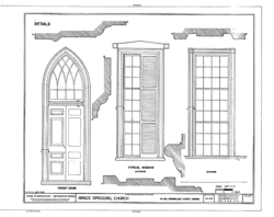 The exterior of Grace Church reflects the influence of Roman, Greek, and Gothic Revival architecture on mid-nineteenth-century American architectural design. Described as a "temple-form country church",[1] it measures 32' x 48'; there is a small vestry attached to the back of the building. The church sits on a foundation of brick, and has ventilation holes at its base. Its walls are built of handmade bricks, even in color and unglazed; the mortar joints are deliberately precise. Two styles of brickwork were used in construction; the front and east side are of Flemish bond, the north side is of five-course American bond, and the west side is a combination or the two, with four-course American substituted for the five-course. Original penciling may still be seen in the mortar joints.[1]