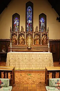 In the middle of the floor is a small wedge-shaped stone brought from Glastonbury, England. The five paintings above the altar represent the Blessed Virgin Mary enthroned, attended by Saint Agnes, St. Cecilia, and Angels. They were painted by T. Noyes Lewis of London.