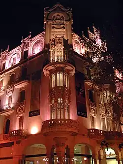 The hotel was designed by Lluís Domènech i Montaner and completed in 1903. It was the first building on the island to have a telephone and electricity supply.[4] Today the building has been converted into a cultural center, home to the Fundación la Caixa. It contains a permanent exhibition of paintings by Anglada Camarasa. The building is noted for its use of brick, together with wrought iron and glazed ceramics, with the use of floral motifs and ceramic tiles. The building is one of the most important examples of Modernisme on the island, with a facade lavishly decorated with sculptures and ceramics.[5]