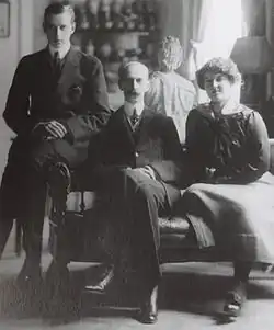 After a honeymoon in Germany, Italy and France, the newlyweds went to Sweden, where an official ceremonial reception awaited them with the state flags of Russia and Sweden waving in Stockholm.[4] In the beginning, the marriage looked successful. The couple set up their home in the Swedish countryside in the province of Södermanland.[22] They spent the summer there, returning in October to Stockholm.[22] Maria added Swedish to the other five languages she spoke, and she became popular in her new country. The Swedes felt she worked harder than her husband did. She was well liked by her father-in-law Gustaf V, who appreciated her "effervescence, charm, and unconventionality."[23] Maria Pavlovna, known in Sweden as the Duchess of Södermanland, was pregnant by the fall, but she quickly realized that she had little in common with her husband. Their relationship was cold. She had little interest in him and he in her. The couple's only child was born on 8 May 1909.[24] He was Prince Lennart, Duke of Småland, later Count of Wisborg (1909–2004)