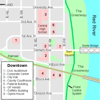 Downtown Grand Forks contains many recognized historic buildings.[31] It is the governmental center of the city and county. It is also used as a gathering place for large community events and festivals. A farmer's market takes place every Saturday from mid-June to mid-September in the Town Square at the corner of 3rd Street S. and DeMers Avenue.[32]