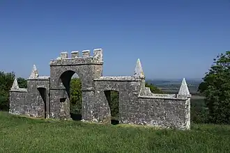 The folly, which was built by a former owner of Creech Grange, Denis Bond, in 1746, is built in the form of a triple arch of ashlar stone. The central archway is surmounted by battlements and flanked by stone walls with smaller doorway arches.[1][2]