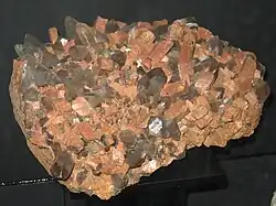 The Red Pyramid of Egypt (c. 2590 BC), named for the light crimson hue of its exposed limestone surfaces, is the third largest of Egyptian pyramids. Pyramid of Menkaure, likely dating 2510 BC, was constructed of limestone and granite blocks. The Great Pyramid of Giza (c. 2580 BC) contains a granite sarcophagus fashioned of "Red Aswan Granite". The mostly ruined Black Pyramid dating from the reign of Amenemhat III once had a polished granite pyramidion or capstone, which is now on display in the main hall of the Egyptian Museum in Cairo (see Dahshur). Other uses in Ancient Egypt include columns, door lintels, sills, jambs, and wall and floor veneer.[69] How the Egyptians worked the solid granite is still a matter of debate. Tool marks described by the Egyptologist Anna Serotta indicate the use of flint tools on finer work with harder stones, e.g. when producing the hieroglyphic inscriptions.[70] Patrick Hunt[71] has postulated that the Egyptians used emery, which has greater hardness.