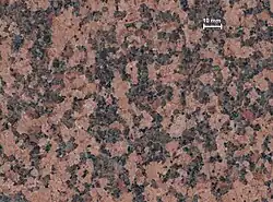 The word "granite" comes from the Latin granum, a grain, in reference to the coarse-grained structure of such a completely crystalline rock.[2] Granites can be predominantly white, pink, or gray in color, depending on their mineralogy. Granitic rocks mainly consist of feldspar, quartz, mica, and amphibole minerals, which form an interlocking, somewhat equigranular matrix of feldspar and quartz with scattered darker biotite mica and amphibole (often hornblende) peppering the lighter color minerals. Occasionally some individual crystals (phenocrysts) are larger than the groundmass, in which case the texture is known as porphyritic. A granitic rock with a porphyritic texture is known as a granite porphyry. Granitoid is a general, descriptive field term for lighter-colored, coarse-grained igneous rocks. Petrographic examination is required for identification of specific types of granitoids.[3] The alkali feldspar in granites is typically orthoclase or microcline and is often perthitic. The plagioclase is typically sodium-rich oligoclase. Phenocrysts are usually alkali feldspar.[4]