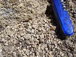 Chemical weathering of granite occurs when dilute carbonic acid, and other acids present in rain and soil waters, alter feldspar in a process called hydrolysis.[50][51] As demonstrated in the following reaction, this causes potassium feldspar to form kaolinite, with potassium ions, bicarbonate, and silica in solution as byproducts. An end product of granite weathering is grus, which is often made up of coarse-grained fragments of disintegrated granite.