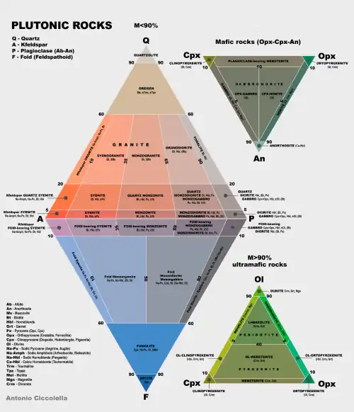 Granitic rocks are classified according to the QAPF diagram for coarse grained plutonic rocks and are named according to the percentage of quartz, alkali feldspar (orthoclase, sanidine, or microcline) and plagioclase feldspar on the A-Q-P half of the diagram. True granite (according to modern petrologic convention) contains between 20% and 60% quartz by volume, with 35% to 90% of the total feldspar consisting of alkali feldspar. Granitic rocks poorer in quartz are classified as syenites or monzonites, while granitic rocks dominated by plagioclase are classified as granodiorites or tonalites. Granitic rocks with over 90% alkali feldspar are classified as alkali feldspar granites. Granitic rock with more than 60% quartz, which is uncommon, is classified simply as quartz-rich granitoid or, if composed almost entirely of quartz, as quartzolite.[5][6][7]